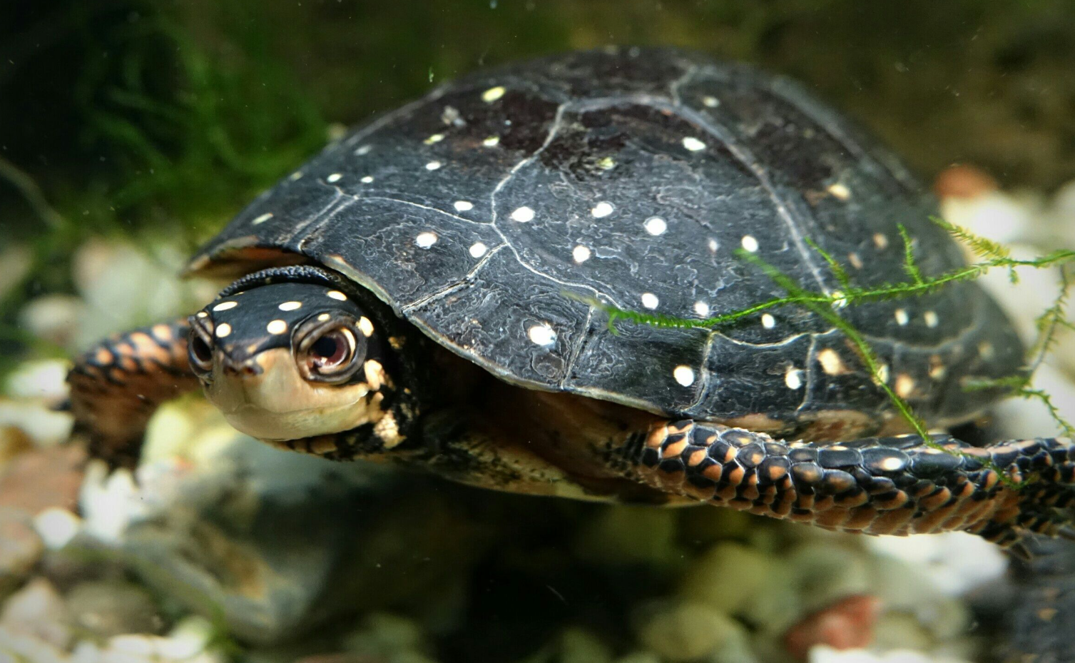 Semi-aquatic turtles like the Spotted Turtle, with their striking yellow spots, are unique freshwater turtle species that can be a centerpiece in your tank. The Spotted Turtle care is also beginner-friendly because they don’t need much to thrive. Give them a tank with clean, shallow water and feed them a well-maintained diet, and they’re good to go.
