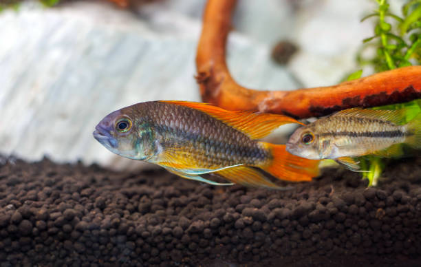 Building an ideal tank for dwarf cichlids starts with getting the right dimensions and layout. Because these pets are small, between 2 and 3 inches long, a 20-gallon tank per pair is the standard. It should also preferably be rectangular, not tall.