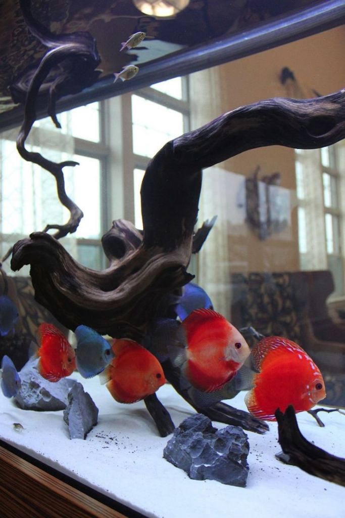Achieving the right water conditions is just the beginning when creating the ideal habitat for red discus. Take things a step further by replicating their natural Amazonian habitat with live aquatic plants and branching roots. Throw in some driftwood, smooth pebbles, and dark substrate to make your pets feel at home and provide shelter to retreat or relax when overstimulated.