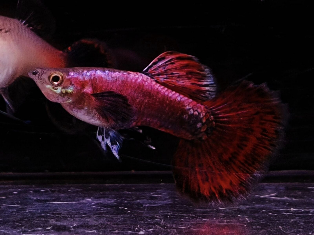 Embrace feminine energy in your tank by adding bright neon Magenta Guppy. It has a bright dark pink scale tone, but under different lighting, this color varies from light pink to deep purple. That’s why some hobbyists classify the Magenta guppy as part of the Purple Guppy type.