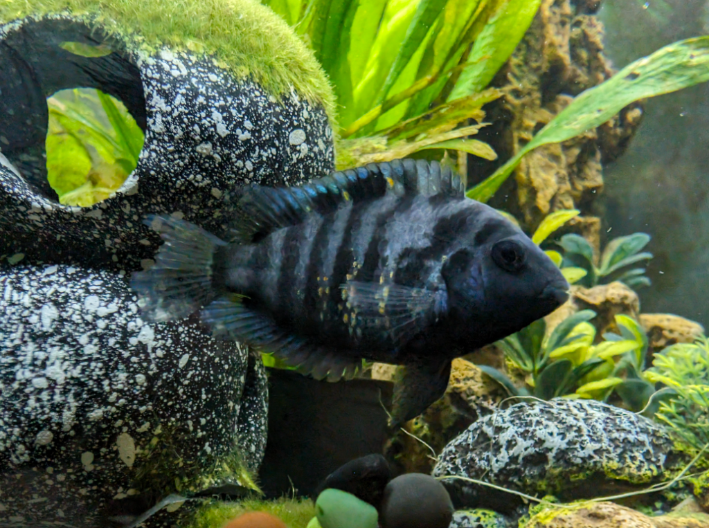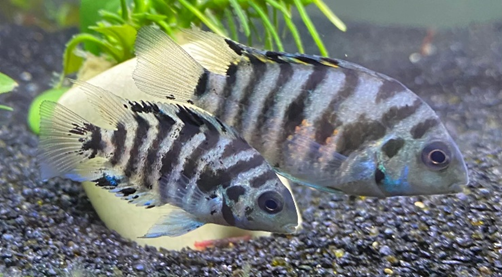 The convict cichlid is a small to medium-sized fish with an elongated oval-shaped body. The main distinctive feature is the contrasting black and white vertical stripes that adorn its body, resembling the appearance of a convict’s uniform, hence the name. These stripes are more prominent in males, especially during breeding.