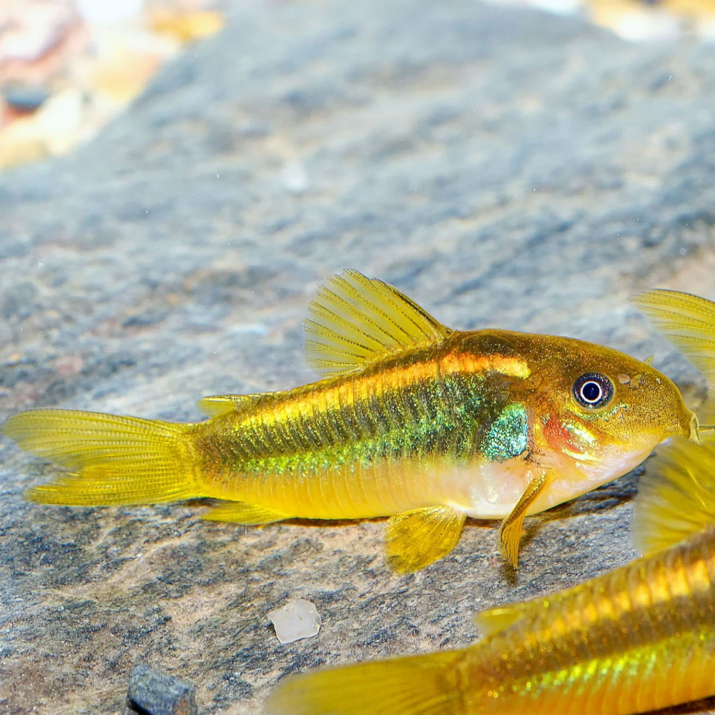Give your aquarium a some color with the Gold Laser Cory, a schooling bottom-dweller famous for its golden appearance, cheerful personality, substrate cleaning efficiency, and low maintenance.