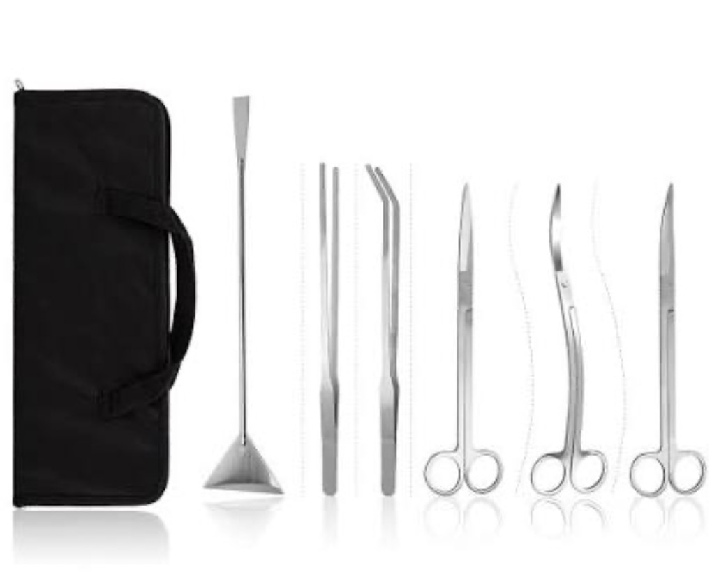 You can choose between regular all-in-one kits with curved scissors, straight and curved tweezers, spatulas, algae scrapers, and a tool holder, or get an engraved stainless steel set.