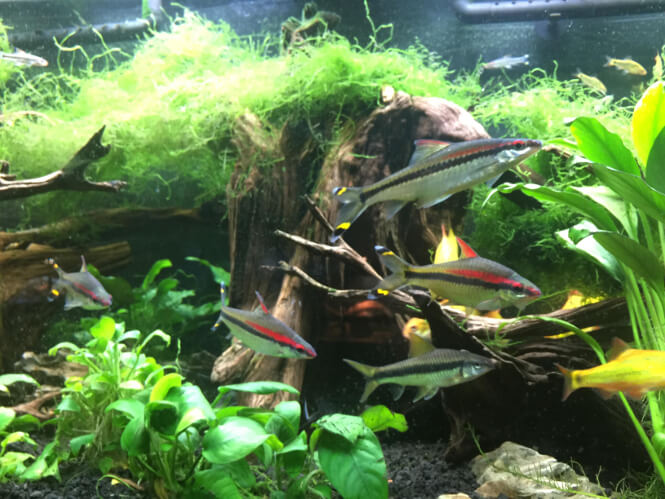 Here’s a shot from one such shark tank where a Siamese algae eater is schooling with Dension barbs: