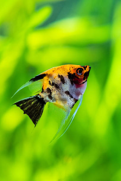 Koi Angelfish stand out because of their bright orange and white coloration with patches of black and yellow in varying patterns, like the Japanese Koi.